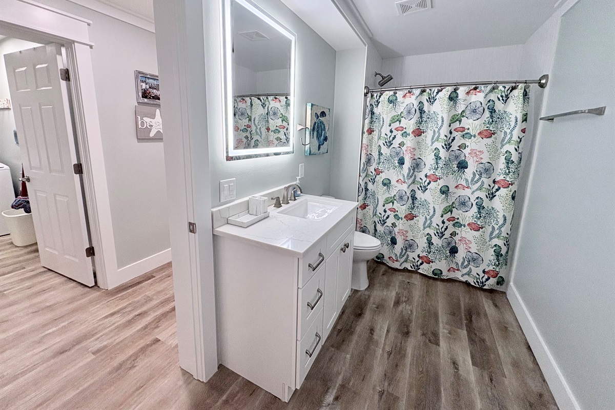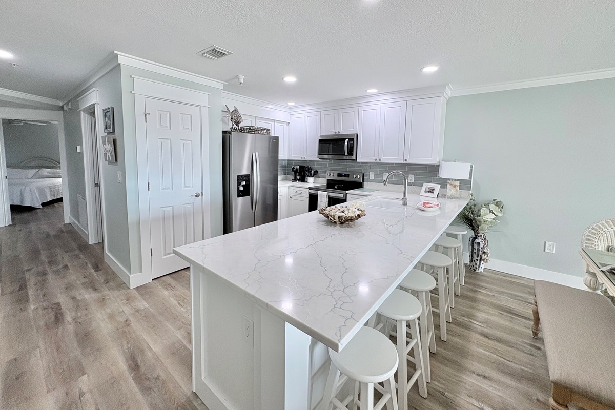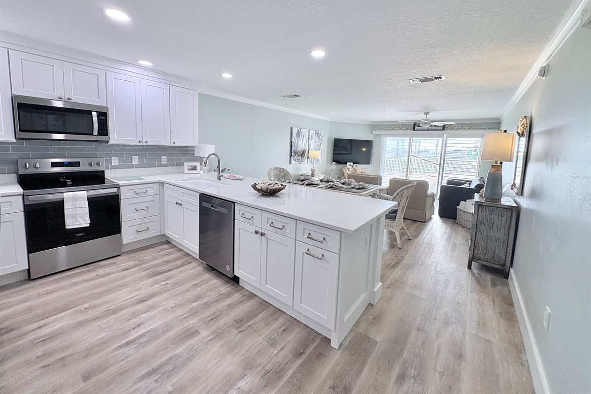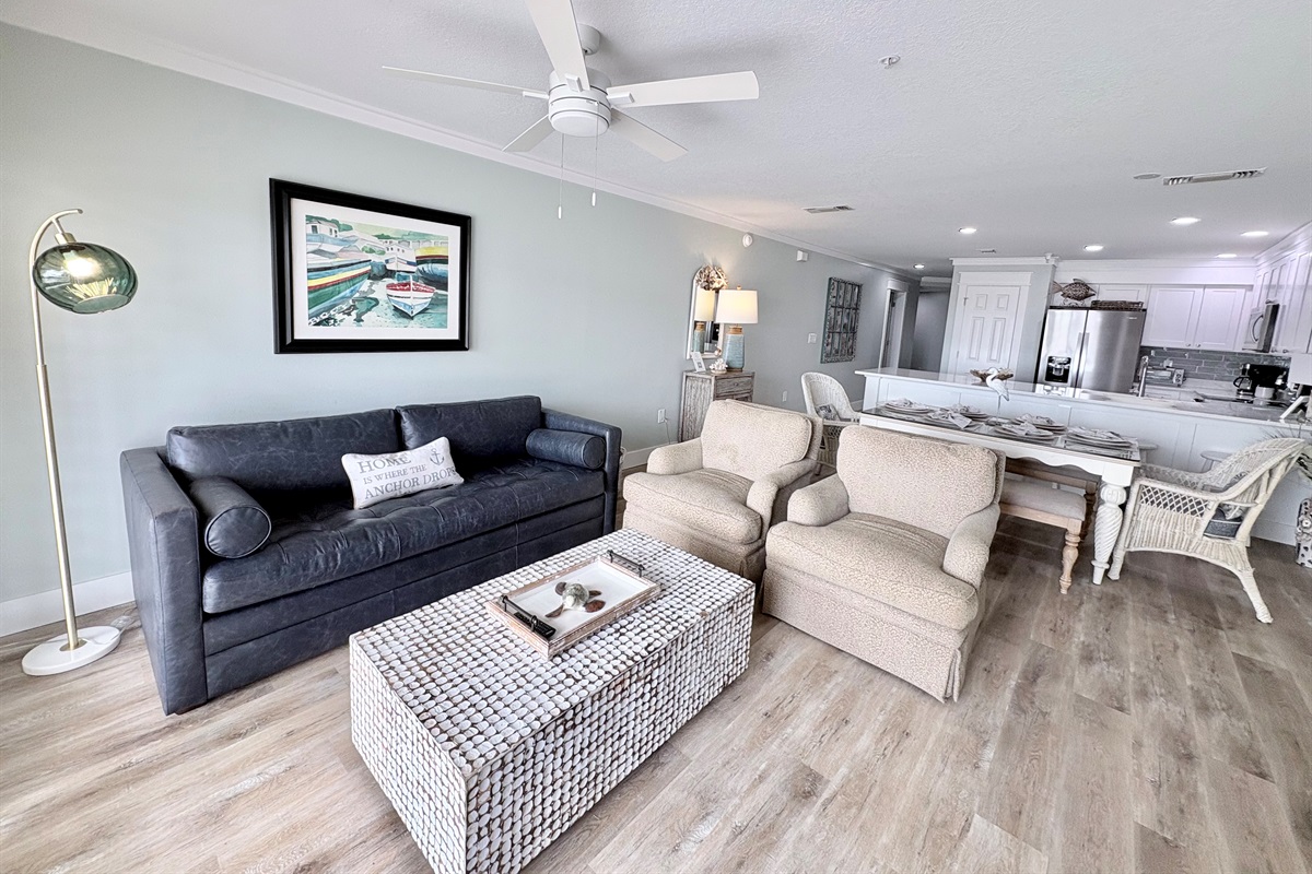 2 Bedrooms • 2 Bathrooms 2 Baths • Sleeps 1-8This newly renovated condo features two king bedrooms, including a second bedroom designed with additional twin bunk beds, making it perfect for kids or extra guests. A queen sleeper sofa in the living room provides even more sleeping space. The open-concept living area is bright and inviting with comfortable seating, a fully equipped kitchen, and a private balcony where you can unwind after a day at the beach.